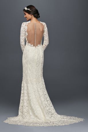 Fully lined dry clean imported. With a completely open back and long lace sleeves this wedding dress is a glamorous showstopper. Our wide selection is elegible for free shipping. Exquisite lace overlay graces this relaxed fit scoopneck sheath.